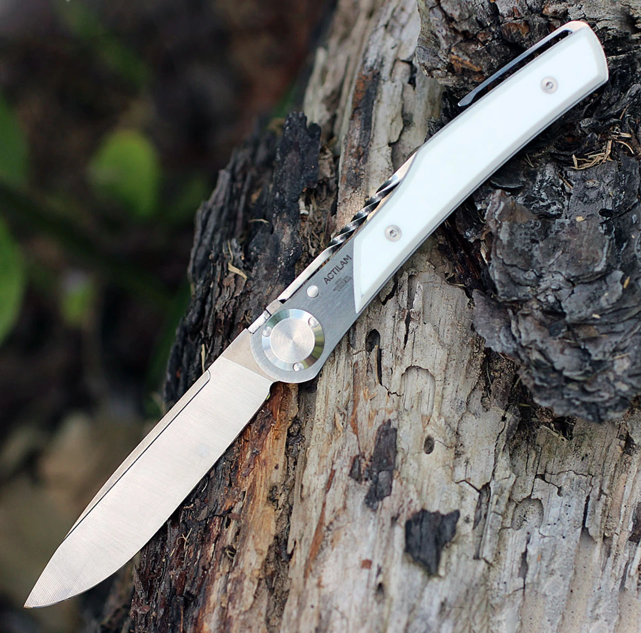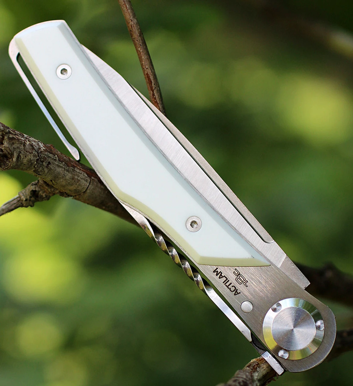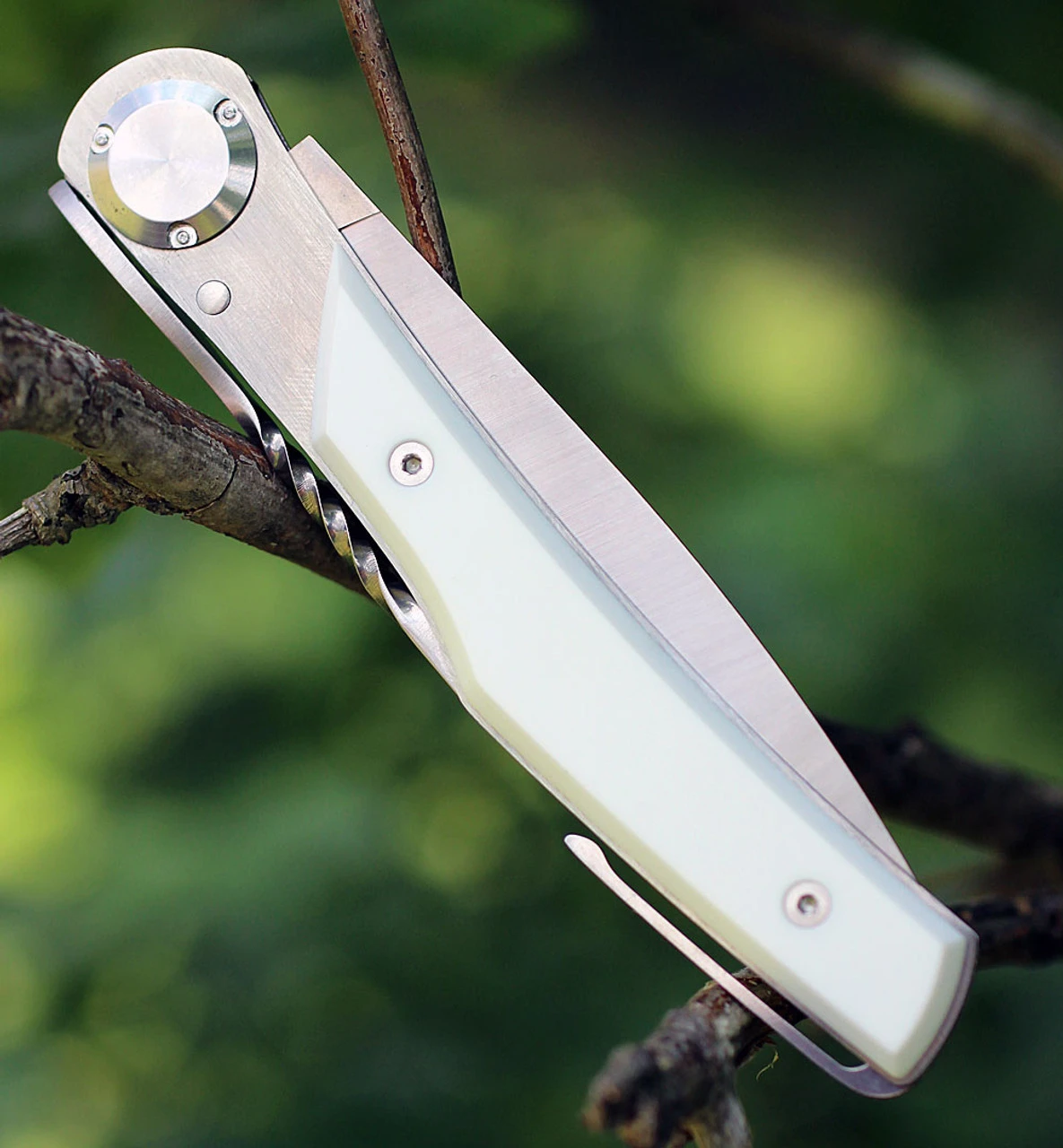 4 3/8″ closed. 3 1/8″ X50CrMoV15N stainless blade with cryogenic quenching. Unique double cone locking system automatically compensates for any possible blade play. The central pivot uses a special screw-nut. The large bearing surfaces of the flanges guarantee a perfect guidance and a long life for the action of the knife. White Corian handles. Slim profile pocket clip. Metal storage tin.