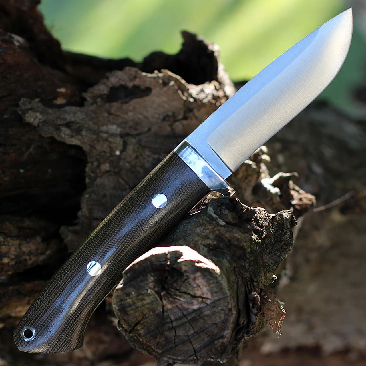 The Classic Drop Point Hunter is Bark River Knives’ version of Bob Loveless’ famous Drop Point Hunter. This pattern was Bob’s idea of the perfect knife for hunters to carry while pursuing all medium and large species of North American Game. The slightly lowered point aids in not inadvertently piercing the stomach or intestines of the game while field dressing. The other subtle feature of the design is how the sharp edge drops away from the line of the hand to increase the cutting angle and make the knife cut more efficiently. The Bark River version of the Drop Point Hunter is the same size as the original loveless. The main difference is that Bob’s were hollow ground and Bark River’s has their famous convex grind to a razor sharp edge. A “classic” design with a Bark River flair to it.