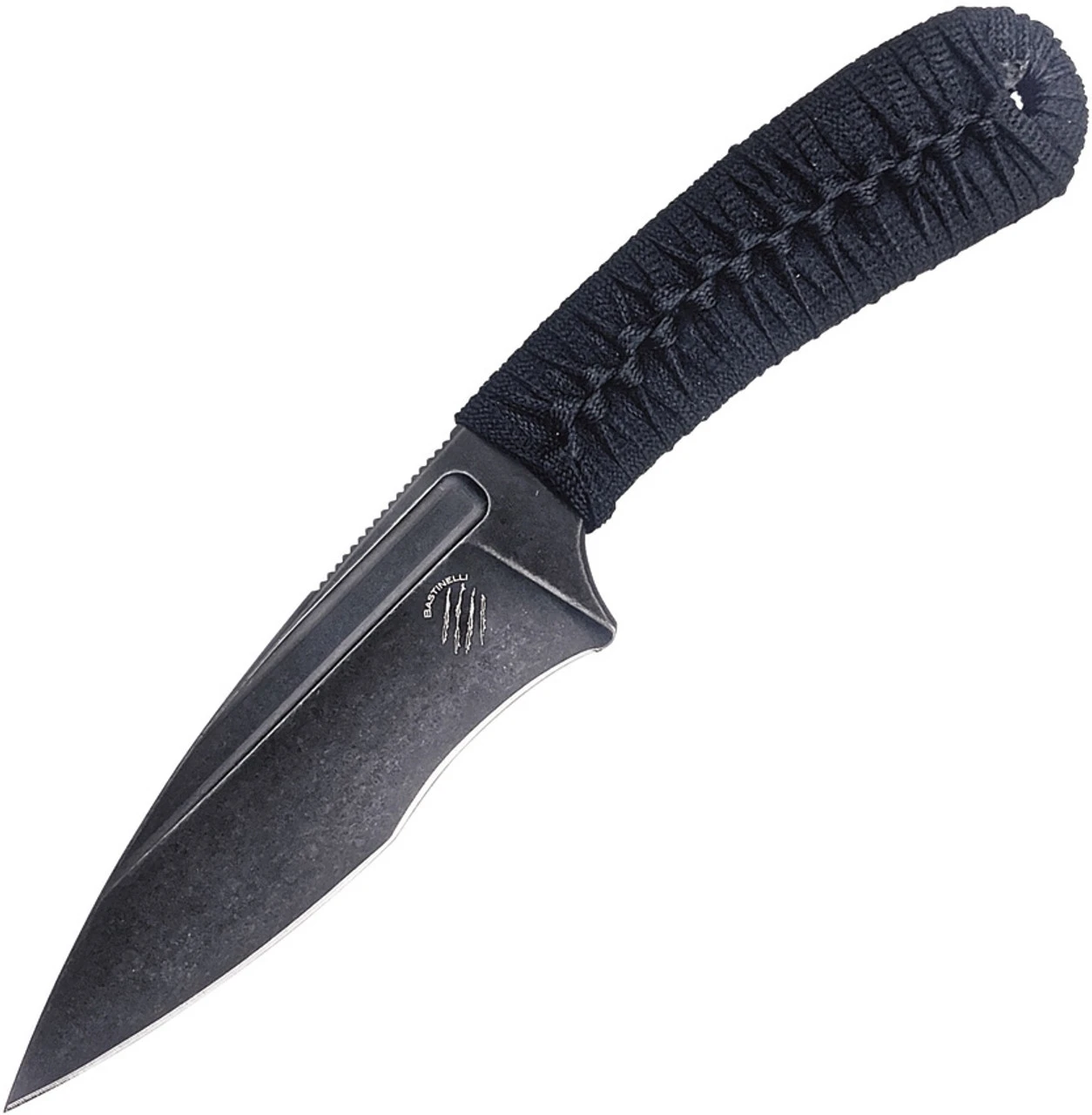 Bastinelli Creations SIN Fixed Blade BAS215C, 3.5″ N690Co Black Stonewashed Blade, Black Cord Wrapped Handle, Kydex Sheath