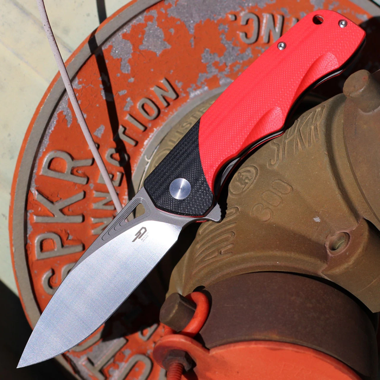 Bestech Airsteam Folding Knife (BG47C) – 3.9″ D2 Two Tone Satin & Gray Drop Point Blade, Red and Black G-10 Handle