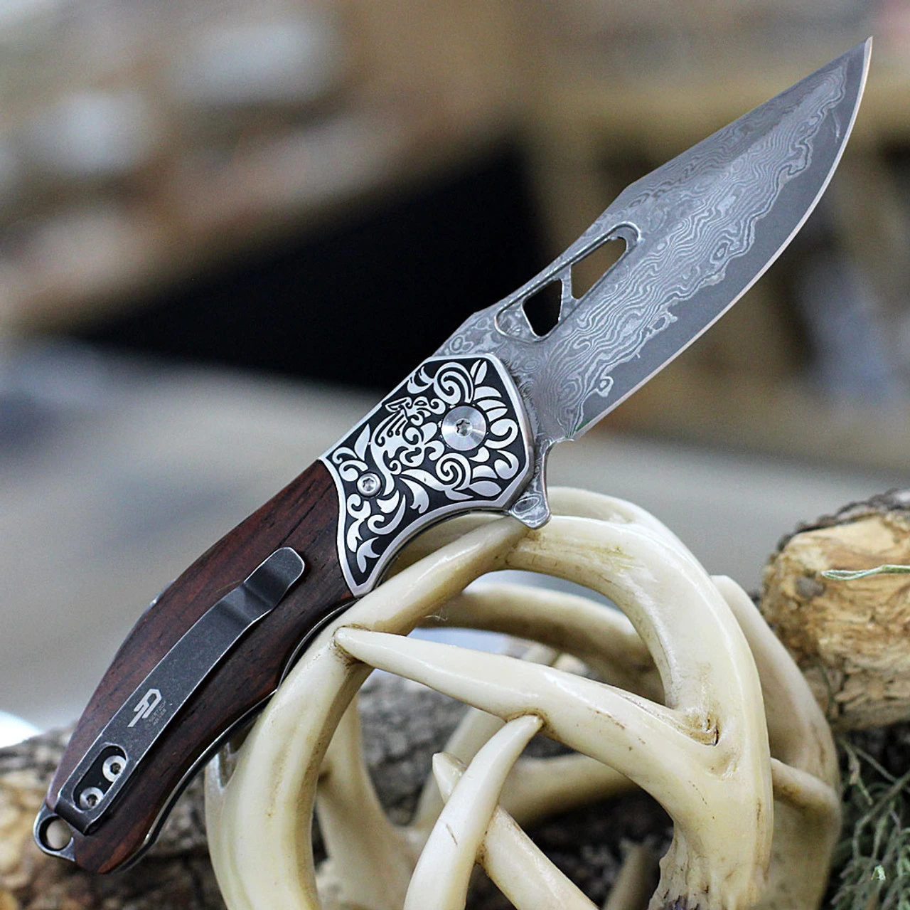 Bestech Draco Folding Knife (BG48) – 3.2″ Damascus Clip Point Blade, Stainless Steel Handle and Bolster with Wood Scales