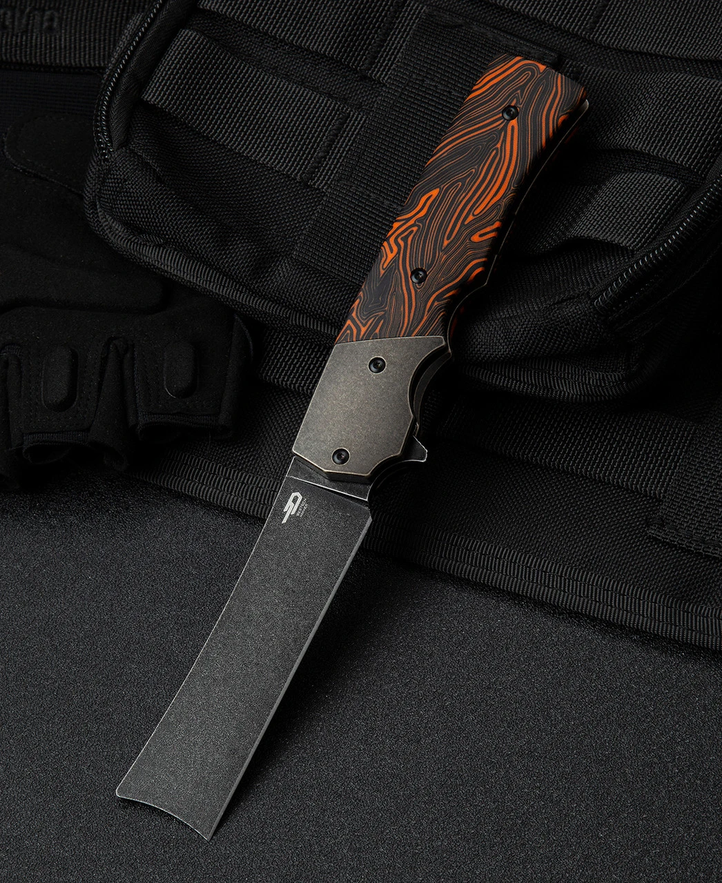 Bestech Knives Spanish Tip Razor BT2101D, 3.66″ M390 Black PVD Coated Plain Blade, Black & Orange G-10 Handles with Titanium Bolsters
