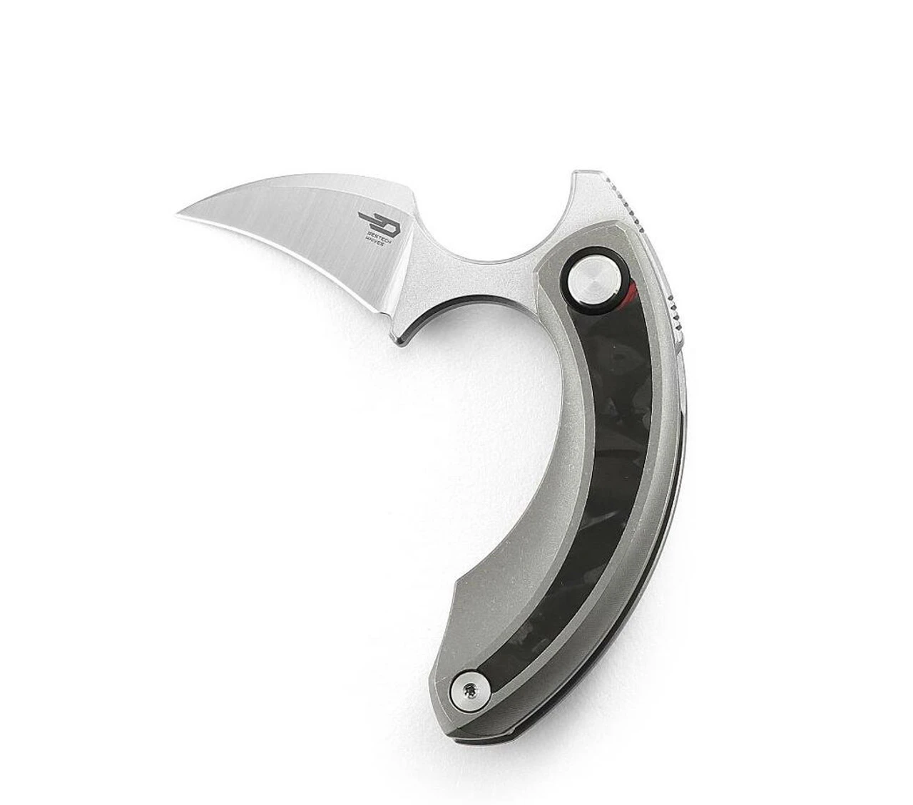 The Bestech Strelit is a folding knife that aquires a hawkbill M390 blade. The unique handle is made out of titanium with black and red carbon fiber inlay. This knife uses high quality materials with excellent fit and finish as well as locking mechanism.Â