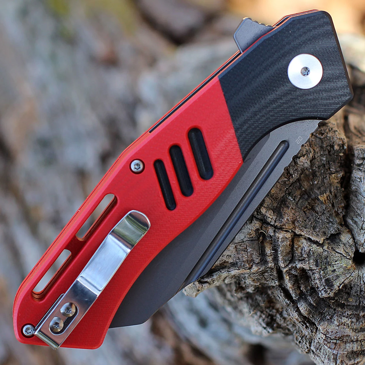 Bestech Rockface Folding Knife (BG46D) – 3.4″ D2 Black Wharncliffe Blade, Red & Black G-10 Handle