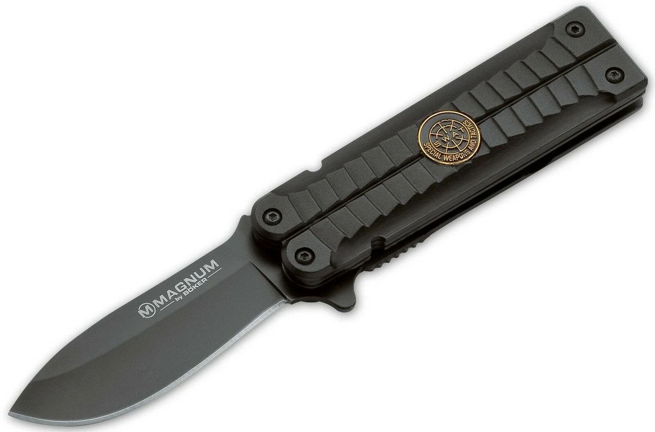 Boker Magnum 01MB954 Black Papillon, 2.5″ 440 SS Black Coated Plain Edge, SWAT Linerlock