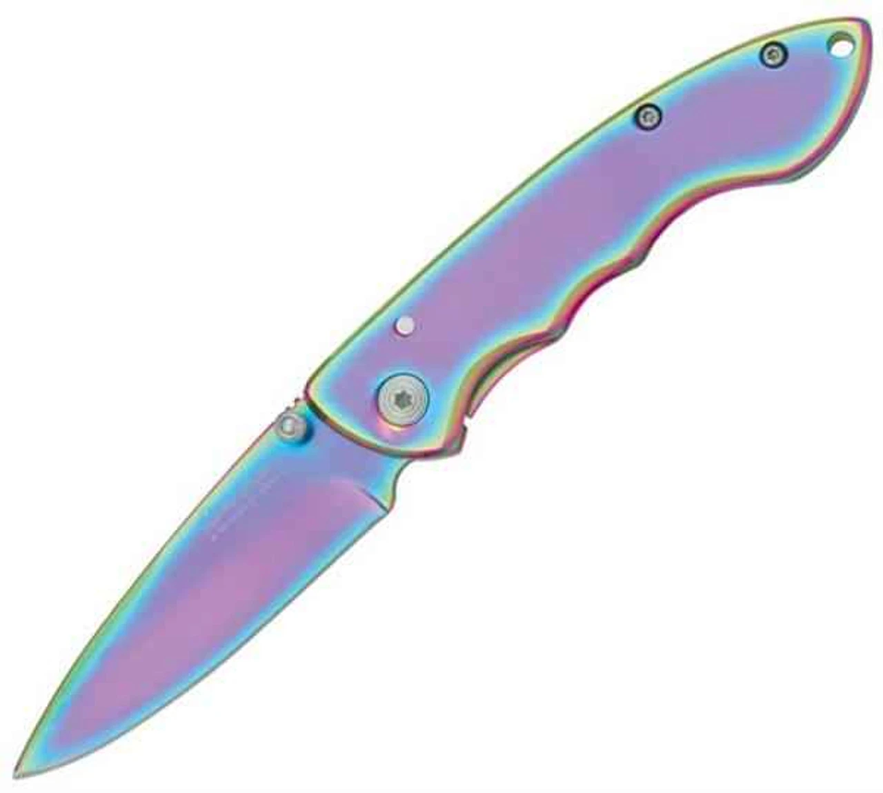 A real eye-catcher! This attractive folding knife shows off an array of colors on the handle and the 440 stainless steel blade, created by a complex treatment process. The 2 7/8″ blade is held open by a frame lock mechanism. Includes pocket clip and lanyard hole.