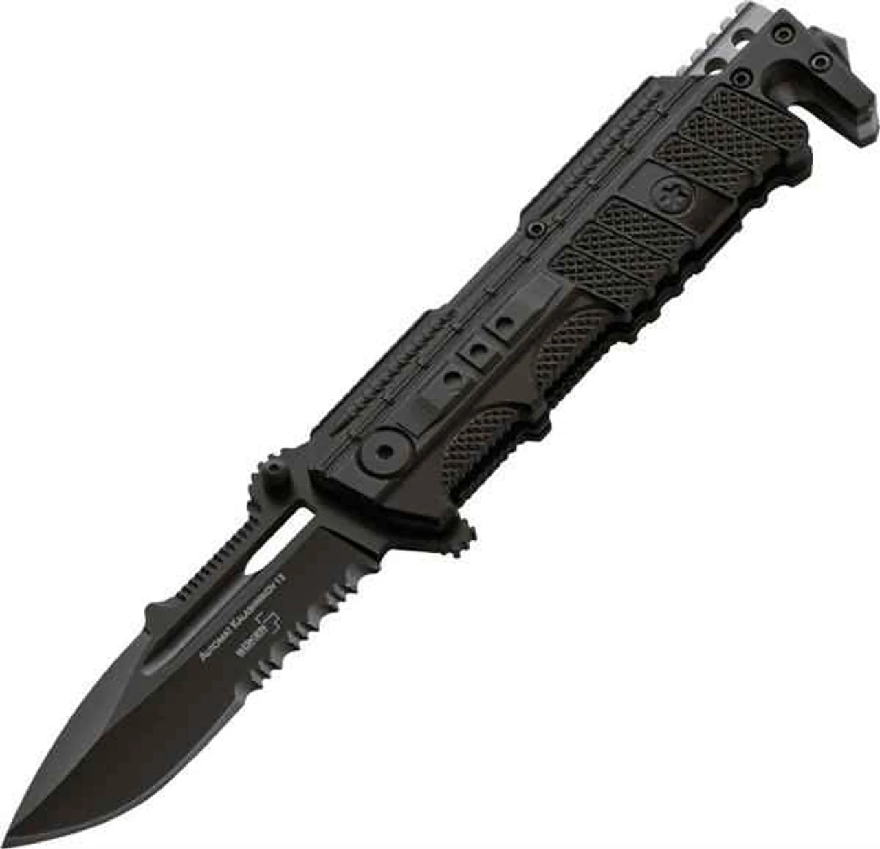 The technical pioneering spirit of General Kalashnikov and his masterpiece, the construction of the world famous and probably most common assault rifles shows itself in the 65th Anniversary of the legendary weapon. As the official manufacturer of Kalashnikov knives, we honor the success of General Kalashnikov, and dedicate this whole series of limited edition knives to this special occasion. Each model will feature the exclusive anniversary blade etch and individual serial number, and will be limited to just 650 pieces worldwide! The latest generation of Kalashnikov folding knives not only convinces with an outstanding grip of the black finish aluminum scales, but also includes a belt cutter and solid, removable glass breaker tip. The steel plates are the base for the secure liner locking mechanism, and the two lanyard holes ensure the securing of the knife against loss. The spear point black finished blade with aggressive serrations is made of 440C stainless steel, and can be easily opened with the flipper or thumb stud. Ridged cutout on top of blade. Extended tang. Does not have pocket clip. Includes a durable Cordura sheath.
