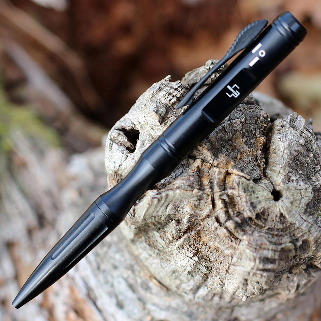 Meet your new favorite pen!  This fully functional ink pen contains a concealed knife blade – perfect for opening packages, or tackling any small cutting chores. Just twist the handle to reveal the pen point, or push up on the clip to extend the D2 steel blade, which is housed in a durable aluminum body.Â