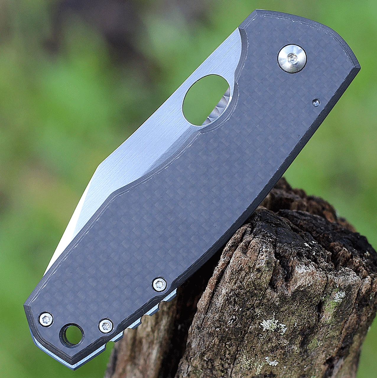 Until now, Jesper Voxnaes has been known to most customers as a designer of various fixed blades. But for some time now, Jesper has also had great success building folders. His Vox F3 Titan Framelock compels with the same virtues and qualities as his fixed blade designs – strength, high utility, off-beat yet completely practical compositions. These updated models of the original F3 (item 01BO333) feature premium S35VN blade steel, and are now available in a variety of handle material and two sizes. The added details, such as the blue anodized titanium clip (tip-up) and the blue anodized “”Nessie Spacer,”” provide a special flair. This model features a lightweight carbon fiber handle scale and satin finished blade.
