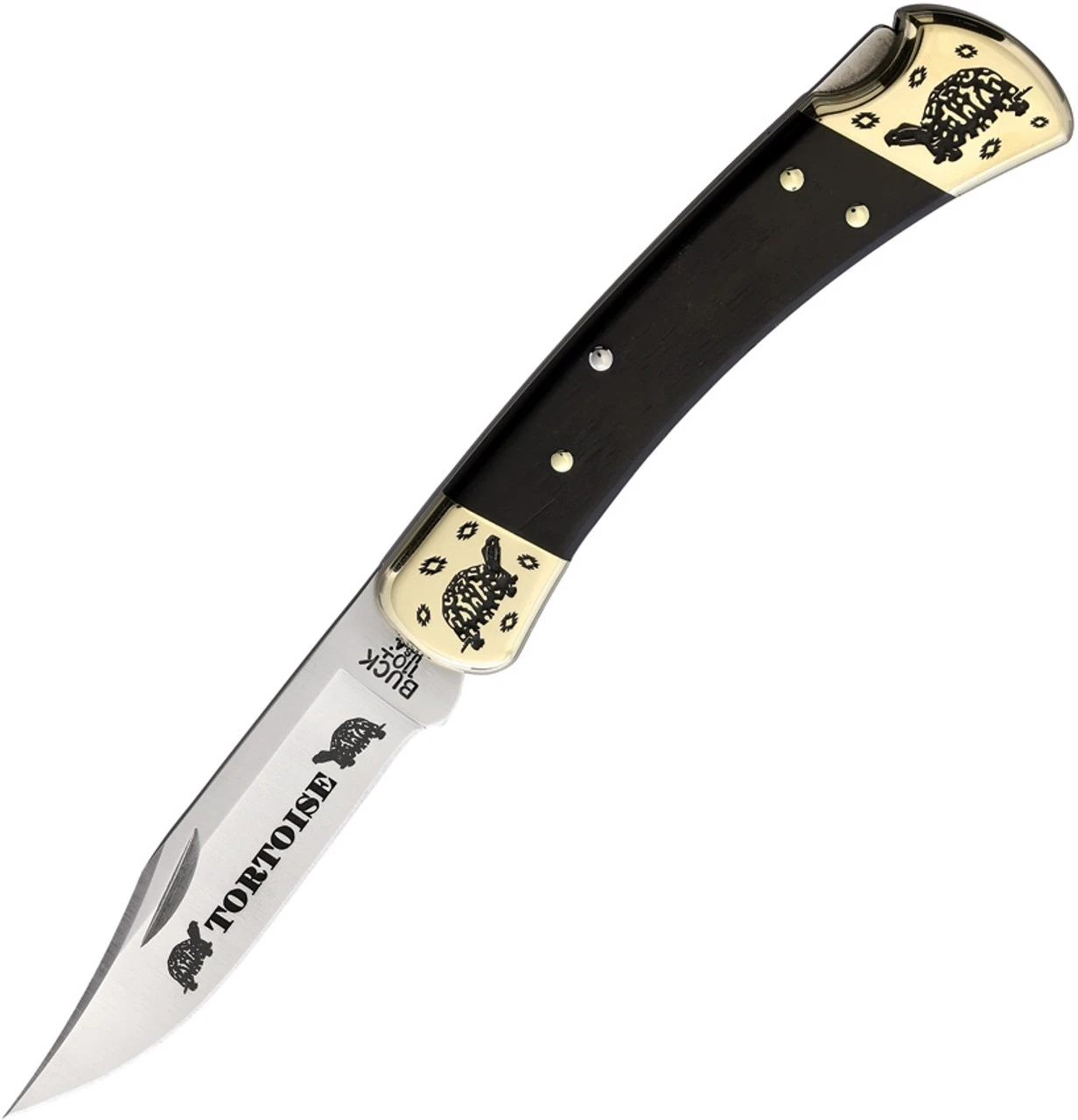 Brian Yellowhorse Custom Buck 110 Tortoise (YH399) 3.75″ Satin 420HC Stainless Steel Clip Point Blade w/ Tortoise Etching, Ebony Wood Handle w/ Etched Brass Bolsters