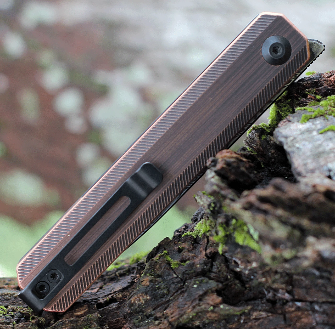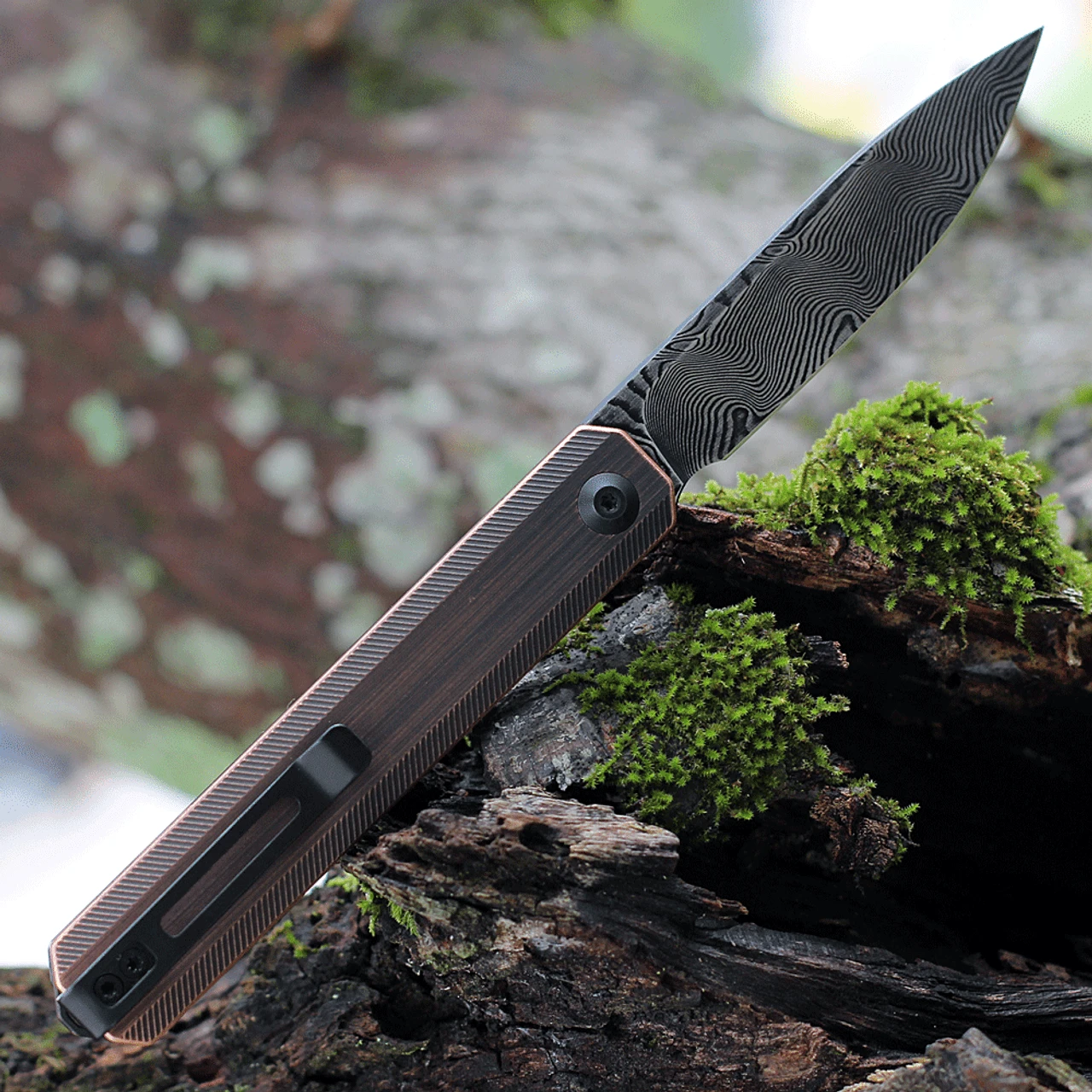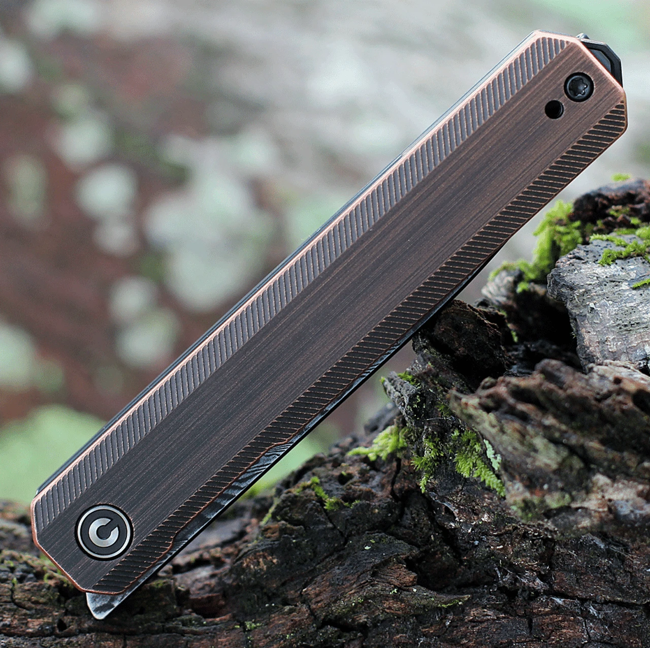 CIVIVI Exarch Folding Knife (2003DS-2)- 3.22″ Damascus Drop Point Blade, Black Hand Rubbed Copper Handles