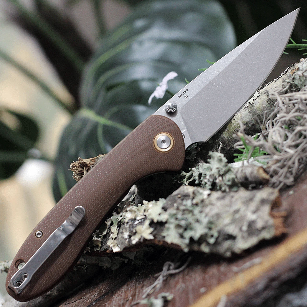 CJRB Cutlery Feldspar J1912-BNC, 3.53″ D2 Steel Stonewashed Plain Blade, Contoured Brown G-10 Handle