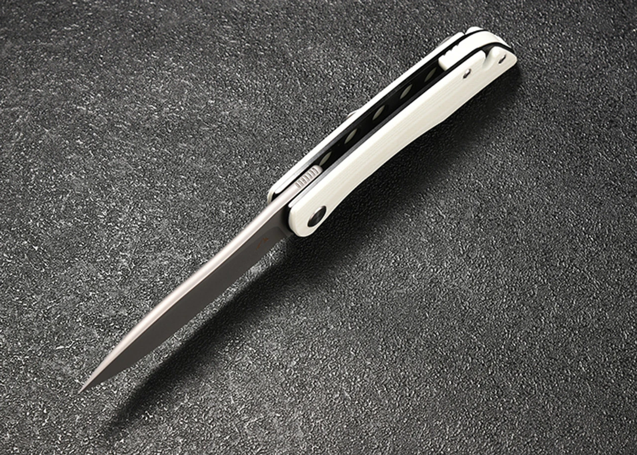 - White G-10 handle scales on steel liners.