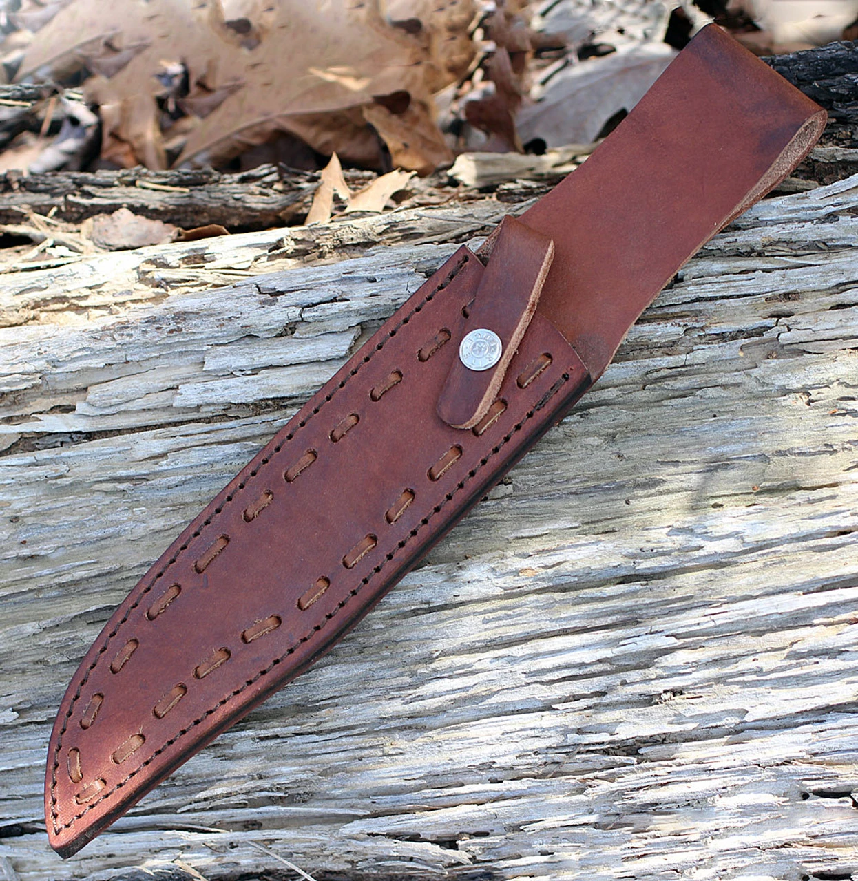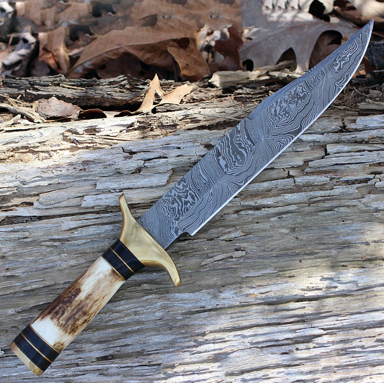 Damascus 1033 Iron Maiden Bowie, 9″ Damascus Plain Blade, Round Stag Handle