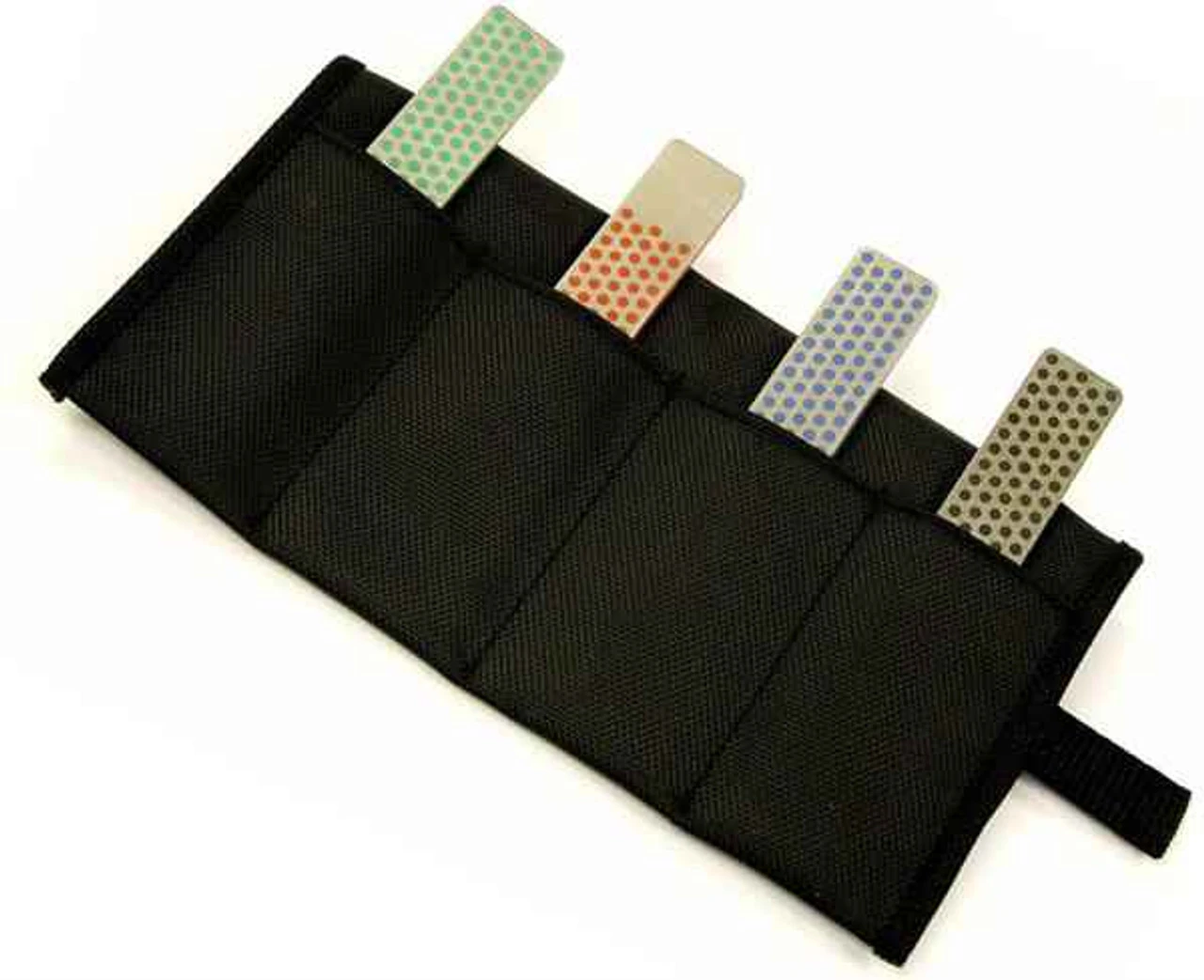 Convenient4 pocket models ofDiamond Whetstone and Machinist sharpeners with convenient black fabric tool roll for easy access for all your sharpening needs. Kit of 4 assorted models includes Three 4″ Diamond Whetstone in Extra-Coarse diamond (60 micron / 220) when significant removal of material is needed for a damaged edge; Coarse diamond (45 micron / 325) to quickly restore a neglected edge and Extra-Fine diamond (9 micron / 1200 mesh) to polish and refine a razor edge after sharpening with a coarser diamond. One 4″ Machinist Diamond Whetstone Stone in Fine diamond (25 micron / 600 mesh) for a razor sharp edge. Size: 4 1/3 x 7/8 x 3/16Sharpening with diamonds is fast and easy. No messy oils neededsharpen dry or with water.Durable construction will provide years of consistent performance and reliable service For proper tool maintenance, woodworkers, chefs and other professionals rely on the superior quality and versatility of DMTf, products. Made in USA.
